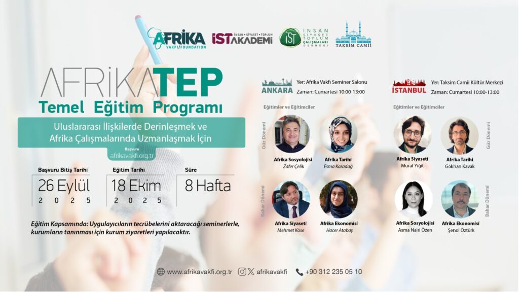 Afrika Vakfı, 8 hafta sürecek güz eğitim programını duyurdu. Afrika Temel Eğitim Programı (AFRİKATEP) başvuru süreci başladı. AFRİKATEP Ankara ve İstanbul’da hem çevrimiçi hem de yüz yüze gerçekleşecek. Programın temel amacının katılımcıların bilgi birikimlerini derinleştirerek dünyayı doğru anlamaları ve kendilerini doğru konumlandırmaları için yeni ufuklar açmayı sağlamak olduğu belirtiliyor.