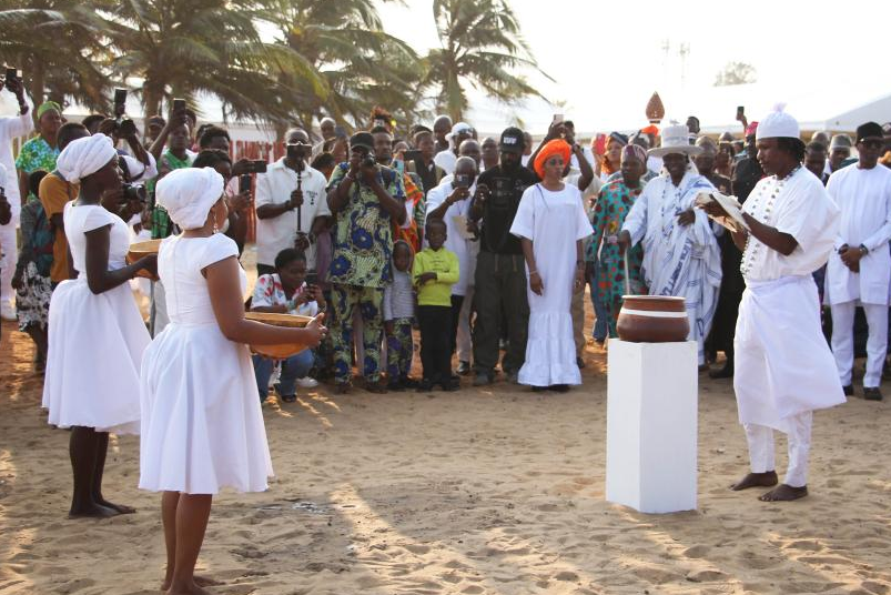 Katılımcılar, eski bir köle açık artırma alanı olan Place aux Encheres’ten başlayarak yaklaşık iki kilometrelik bir yürüyüşle, Amerika’ya zorla götürülen Afrikalıların sembolik çıkış noktası kabul edilen Dönüşü Olmayan Kapı’ya ulaştı. Törende barışı simgeleyen beyaz güvercinler bırakıldı.