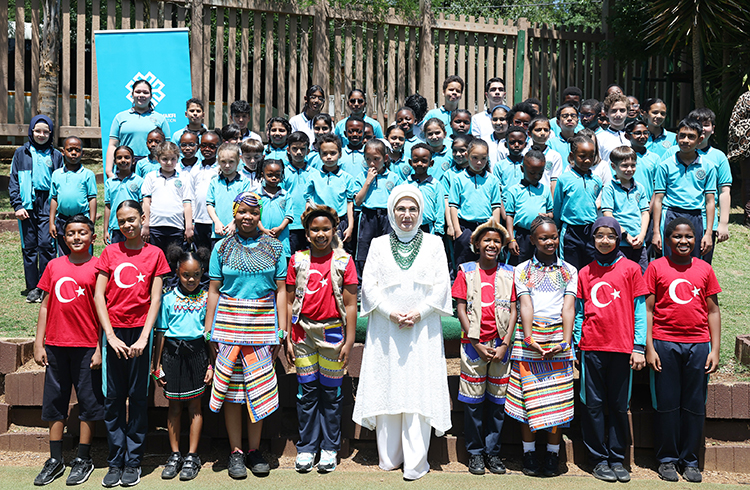 Emine Erdoğan, Türkiye Maarif Vakfı’na bağlı Uluslararası Maarif Okulu’nu ziyaretinde, Maarif Vakfı Güney Afrika Ülke Temsilcisi Abdullah Cevizci ile öğretmenler tarafından karşılandı. Karşılama sırasında iki öğrenci kendisine çiçek takdim etti.