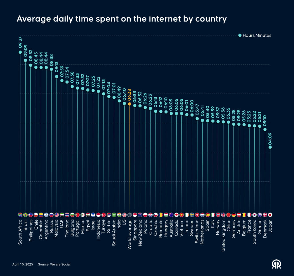 AA’nın yayınladığı “Ülkeler Bazında İnternette Geçirilen Günlük Ortalama Süre” başlıklı infografikte, Güney Afrika’nın internet kullanımında dünya çapında zirveye yerleştiği ortaya kondu. Güney Afrikalılar, günde ortalama 9 saat 37 dakika internet kullanırken, küresel ortalama ise 6 saat 38 dakika olarak belirlendi.