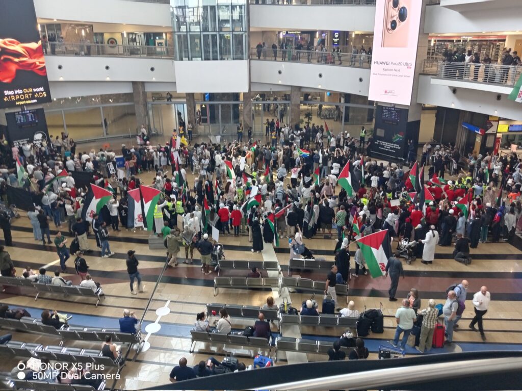 Güney Afrika’daki Filistin Dayanışma Hareketi üyeleri de karşılamada hazır bulundu ve “Gazze için adalet” sloganları atıldı. Aktivistler yakınlarına sarılırken gözyaşlarını tutamadı.