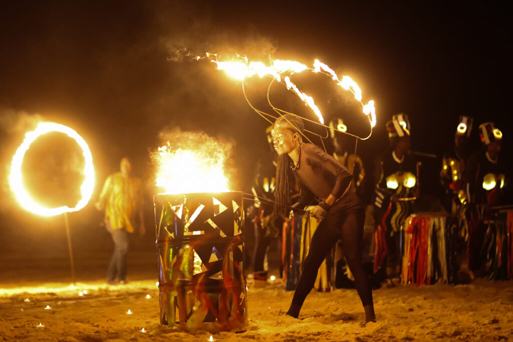 Senegal’in ünlü geleneksel müzik ve dans topluluğu Ngueweul Rythme, Atlas Okyanusu kıyısında turistlere yönelik etkileyici bir ateş gösterisi sundu. Dakar yakınlarında gece yarısı gerçekleştirilen etkinlikte, grubun enerjik perküsyon ritimlerine ateş cambazları eşlik etti.