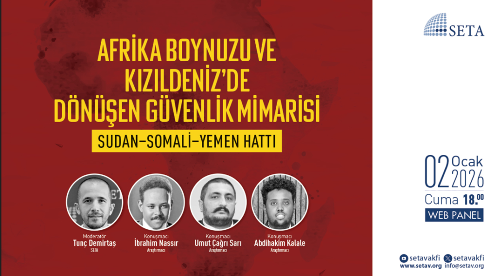 Siyaset, Ekonomi ve Toplum Araştırmaları Vakfı (SETA), Afrika Boynuzu ile Kızıldeniz havzasında değişen güvenlik dengelerini mercek altına alan “Afrika Boynuzu ve Kızıldeniz’de Dönüşen Güvenlik Mimarisi: Sudan–Somali–Yemen Hattı” başlıklı çevrim içi bir panel gerçekleştirdi. Panelde, Sudan’daki çatışmalar, Somali merkezli bölgesel gelişmeler ve Türkiye’nin artan diplomatik rolü çok boyutlu biçimde ele alındı.