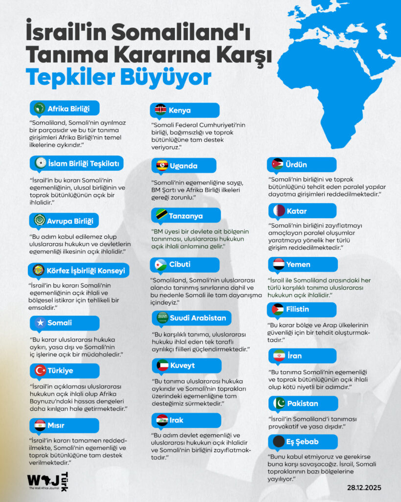 İsrail, cuma günü Somaliland’i “bağımsız ve egemen devlet” olarak tanıyan ilk ülke olmuştu. Bu karar; Türkiye başta olmak üzere Afrika ve Orta Doğu’daki birçok ülke tarafından sert şekilde kınanmıştı.