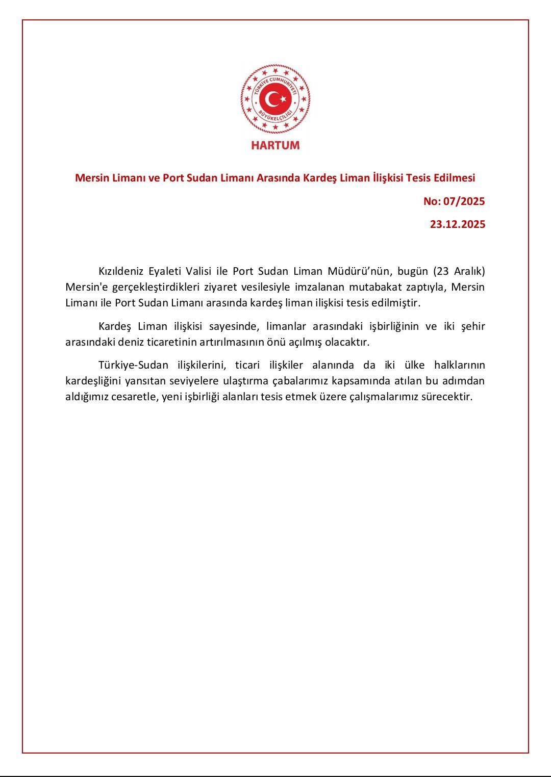 Sudan ile Türkiye, denizcilik ve ticaret alanındaki iş birliğini güçlendirmek amacıyla Port Sudan ile Mersin limanlarını kapsayan bir “kardeş liman” anlaşmasına imza attı. Anlaşma, 23 Aralık’ta Mersin’de düzenlenen törenle resmiyet kazandı. Sudan Kızıldeniz Eyaleti Valisi Mustafa Muhammed Nur ile Sudan Deniz Limanları Kurumu (SPC) Direktörü Gilani Muhammed Gilani’nin Mersin’e gerçekleştirdiği resmi ziyaret sırasında, iki ülke arasında bir mutabakat zaptı imzalandı.