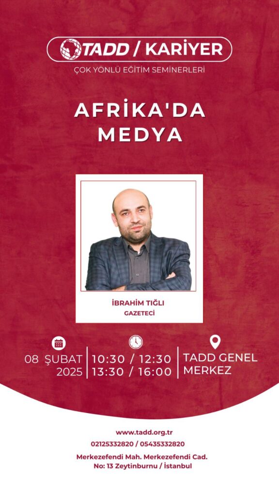 Tüm Afrika’nın Dostları Derneği (TADD) tarafından düzenlenen “Çok Yönlü Eğitim Seminerleri” kapsamında, Gazeteci İbrahim Tığlı 8 Şubat 2025’te “Afrika’da Medya” konulu bir seminer verecek.